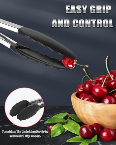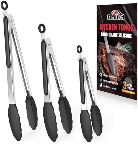 600ºF Heat Resistant Kitchen Tongs, Premium Locking Cooking Tongs with Silicone Tips, Non-Slip Food Tongs for Cooking, Non-Stick, Heavy Duty Stainless Steel Handle, Set of 3-7″ 9″ and 12″ Black